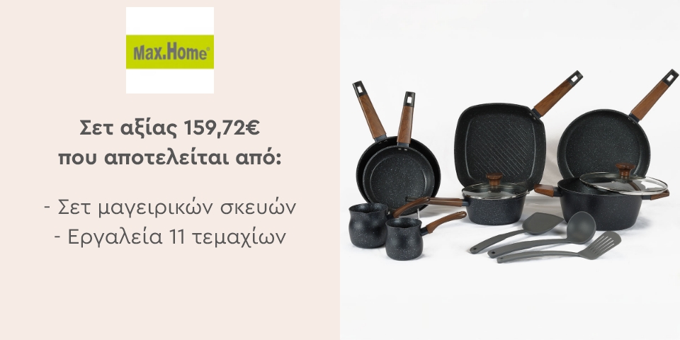 Επειδή τα μαγειρικά σκεύη είναι πολύ hot κατηγορία, έρχεται και η Max Home να προσφέρει σε έναν τυχερό ένα ολοκληρωμένο σετ 11 τεμαχίων! Μπορεί να είσαι εσύ που θα αποκτήσεις: 3 αντικολλητικά τηγάνια, 2 αντικολλητικές κατσαρόλες, 1 γκριλιέρα, 2 μπρίκια και 3 εργαλεία κουζίνας! Εάν σου αρέσει η μαγειρική, αυτό είναι το ιδανικό δώρο για εσένα!
