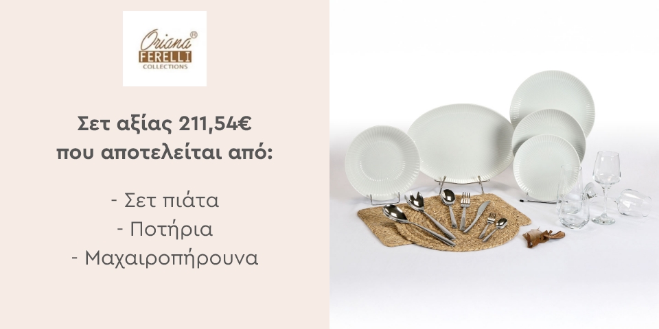 Η Oriana Ferelli προσφέρει για τον διαγωνισμό μας ένα καταπληκτικό δώρο που αποτελείται από τα εξής: ένα σετ πιάτων 21 τεμαχίων (6 πιάτα ρηχά, 6 πιάτα βαθειά, 6 πιάτα φρούτου, 2 πιατέλες και 1 σαλατιέρα), 18 υπέροχα ποτήρια (6 ποτήρια σωλήνα, 6 ποτήρια ουίσκι και 6 ποτήρια κολωνάτα κρασιού) και 32 τεμάχια σε μαχαιροπίρουνα!