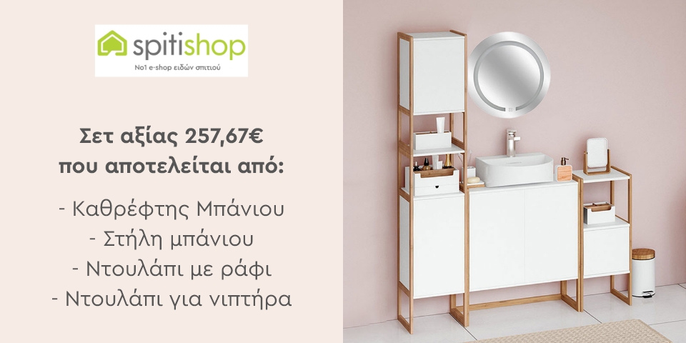 Εάν από την άλλη θέλεις να κάνεις μια ολική ανανέωση στο μπάνιο σου, αυτό το δώρο είναι για εσένα! Το Spitishop προσφέρει σε εσένα, έναν καλαίσθητο στρογγυλό καθρέφτη μπάνιου, μία στήλη μπάνιου με ντουλάπια, ένα ντουλάπι μπάνιου με ράφι και ένα ντουλάπι μπάνιου για νιπτήρα! Όλα από τη σειρά F-V Natureo White, με ξύλο bamboo!