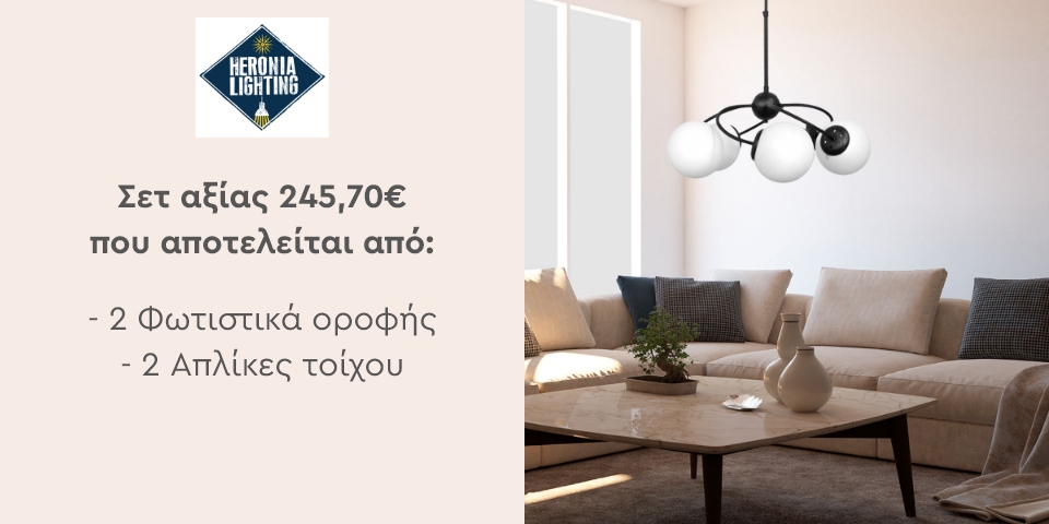 Η Heronia Lighting αναλαμβάνει να εξοπλίσει το καθιστικό και τα δωμάτιά σου με super φωτιστικά! Όποιος κερδίσει αυτό το δώρο, θα αποκτήσει 2 φωτιστικά οροφής (1 πολύφωτο και 1 τρίφωτο), και 2 απλίκες τοίχου. Το στυλ τους, είναι ένας συνδυασμός vintage και μοντέρνου σχεδιασμού που θα αναβαθμίσουν την αισθητική του χώρου σου!