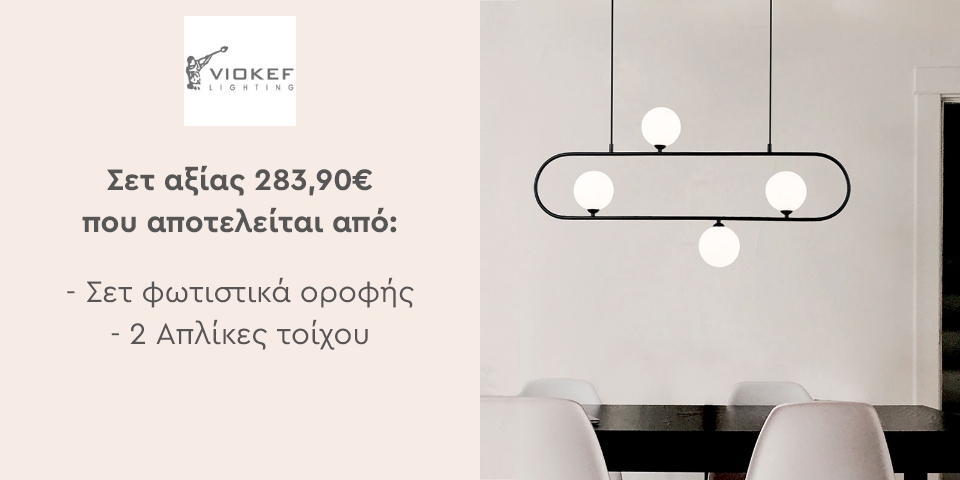 Αν αγαπάς τη μοντέρνα και ιδιαίτερη διακόσμηση, το σετ φωτιστικά οροφής και οι απλίκες τοίχου της Viokef θα σε ενθουσιάσουν. Το σετ αποτελείται από 2 φωτιστικά οροφής (1 πολύφωτο και 1 δίφωτο), ενώ οι πρωτότυπες απλίκες τοίχου της ίδιας σειράς μπορούν να τοποθετηθούν σε όποιο δωμάτιο επιθυμείς!