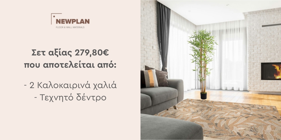 Η New Plan επέλεξε ένα χαλί από την καλοκαιρινή συλλογή της Garden από εξαιρετική ψάθα που ξεχωρίζει για το σχέδιο με τα φύλλα σε μπεζ και εκρού αποχρώσεις. Το δώρο περιλαμβάνει 1 χαλί σε διαστάσεις 133x190 και 1 χαλί σε διαστάσεις 190x250. Το δώρο έρχεται να ολοκληρώσει η προσθήκη του τεχνητού δέντρου μπαμπού ύψους 180εκ. που θα δώσει την πιο καλοκαιρινή αύρα στον χώρο σου!