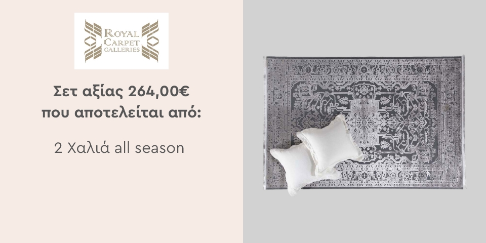 Ένα vintage σχέδιο με ήπια ανάγλυφη επιφάνεια, σε γκρι αποχρώσεις από την Βιοκαρπέτ για τον φετινό μεγάλο διαγωνισμό του Spitishop. Το σετ δώρου περιλαμβάνει 1 χαλί σε διαστάσεις 200x290 και 1 χαλί σε διαστάσεις 160x230.