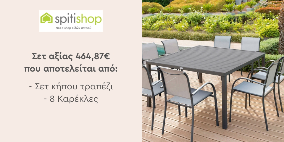 Στο Spitishop είμαστε ξετρελαμένοι με τις αφίξεις μας στα έπιπλα κήπου και θέλαμε να το γιορτάσουμε μαζί σας, δίνοντας ένα ολοκληρωμένο σετ κήπου που περιλαμβάνει τραπέζι και 8 καρέκλες για να απολαμβάνεις τις καλοκαιρινές συναντήσεις με την παρέα και την οικογένεια στον κήπο, το μπαλκόνι ή τη βεράντα!