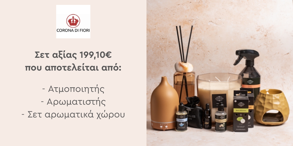 Ένα δώρο για να μυρίσει ολόκληρο το σπίτι. Η Corona di Fiori έρχεται με ένα μεγάλο σετ δώρου που περιλαμβάνει ατμοποιητή, αρωματιστή, αρωματικό αυτοκινήτου και ένα σετ αρωματικών χώρου. Ετοιμάσου να ακούσεις τα πιο όμορφα σχόλια για το πόσο υπέροχα μυρίζει το σπίτι!
