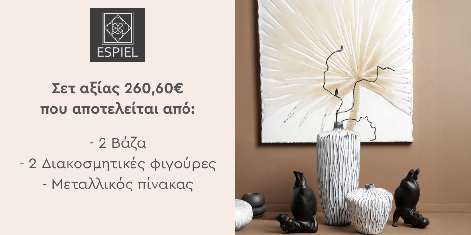 Η Espiel δημιούργησε ένα πολύ ιδιαίτερο σετ με 2 βάζα διαφορετικών διαστάσεων, 2 φιγούρες ιππόταμου που θα τραβήξουν τα βλέμματα και έναν πίνακα που απεικονίζει μια φτέρη.