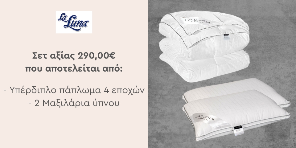 To σετ δώρου της La Luna, περιλαμβάνει 1 υπέρδιπλο πάπλωμα 4 εποχών που θα σου κρατήσει συντροφιά για πολλά χρόνια, και 2 μέτρια μαξιλάρια ύπνου, τα Microdown Pillow Superia Microfiber. Το εξωτερικό τους ύφασμα είναι φτιαγμένο από βαμβακοσατέν 400 κλωστών με σχέδιο ζακάρ και εσωτερικό υλικό εξαιρετικής ποιότητας μικροΐνες. "Ό,τι πρέπει" για να απολαμβάνεις τη χαλάρωση στο κρεβάτι σου!