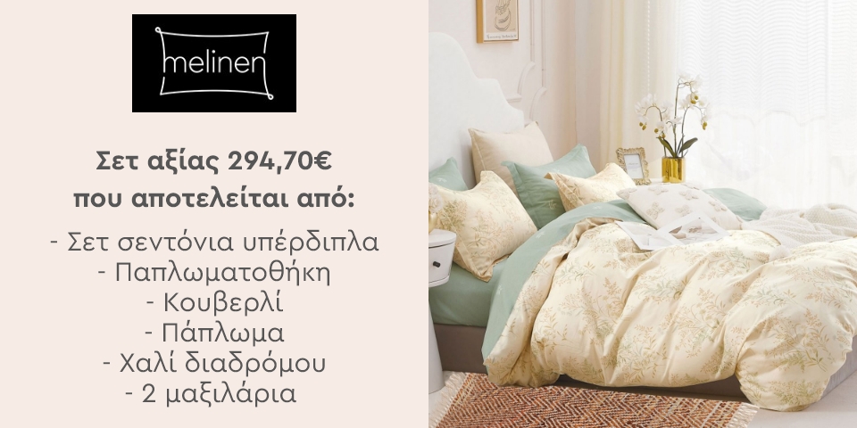 Σε γήινους, ήρεμους τόνους έρχεται και το δώρο της Melinen με ολοκληρωμένο σετ για το κρεβάτι που περιλαμβάνει 1 σετ σεντόνια υπέρδιπλα, και μία παπλωματοθήκη σε ρομαντικό φλοράλ σχέδιο. Ευκαιρία να "ντύσεις" το καινούργιο σου πάπλωμα: το Melinen Satin Stripe 4 Εποχών! Για την άνοιξη και το φθινόπωρο που έχει λίγη δροσούλα, το υπέρδιπλο κουβερλί Melinen Zara Aqua θα σε συντροφεύσει επάξια. Στο σετ θα βρεις επίσης, 2 σκληρά μαξιλάρια ύπνου, τα Melinen Cotton Percale Microfiber, αλλά και το all season χαλί Melinen Wild, το οποίο μπορεί να τοποθετηθεί στο υπνοδωμάτιό σου, ή σε όποιο άλλο δωμάτιο θέλεις!