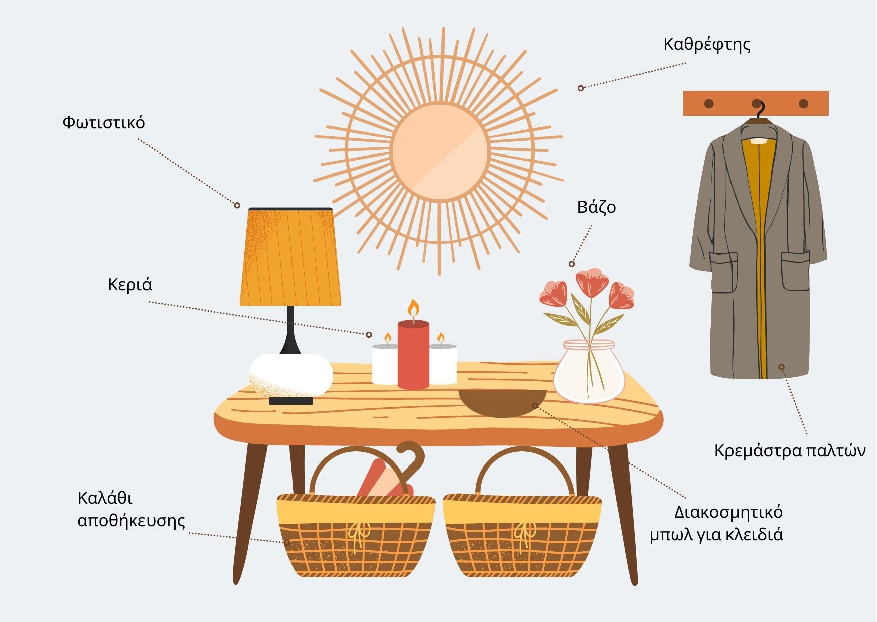 Θα χρειαστείτε ένα τραπέζι ή κάποιο έπιπλο μικρών διαστάσεων, για παράδειγμα μια κονσόλα που να διαθέτει το κατάλληλο ύψος ώστε να μπορείτε να ακουμπάτε εύκολα τα διάφορα προσωπικά σας αντικείμενα γυρνώντας σπίτι. Το πιο συνηθισμένο για αυτά τα έπιπλα είναι να φτάνουν στο ύψος της μέση μας.