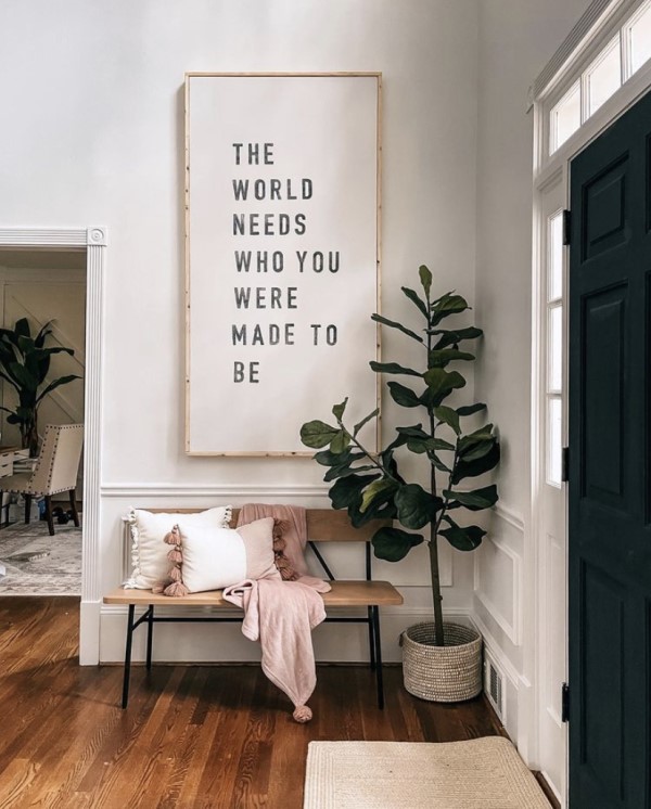 Εναλλακτικά, μπορείτε να επιλέξετε έναν πίνακα ή ένα κάδρο με ένα μήνυμα καλωσορίσματος ή μια φράση που αγαπάτε εσείς ή σας χαρακτηρίζει. Στο εμπόριο θα βρείτε έτοιμα κάδρα με επιγραφές αλλά μπορείτε να κάνετε και εξειδικευμένη παραγγελία. Ακόμη μια ιδέα είναι να βάλετε μια κορνίζα με φωτογραφίες της οικογένειάς σας ή μια σύνθεση με φωτογραφίες από αγαπημένες σας στιγμές.