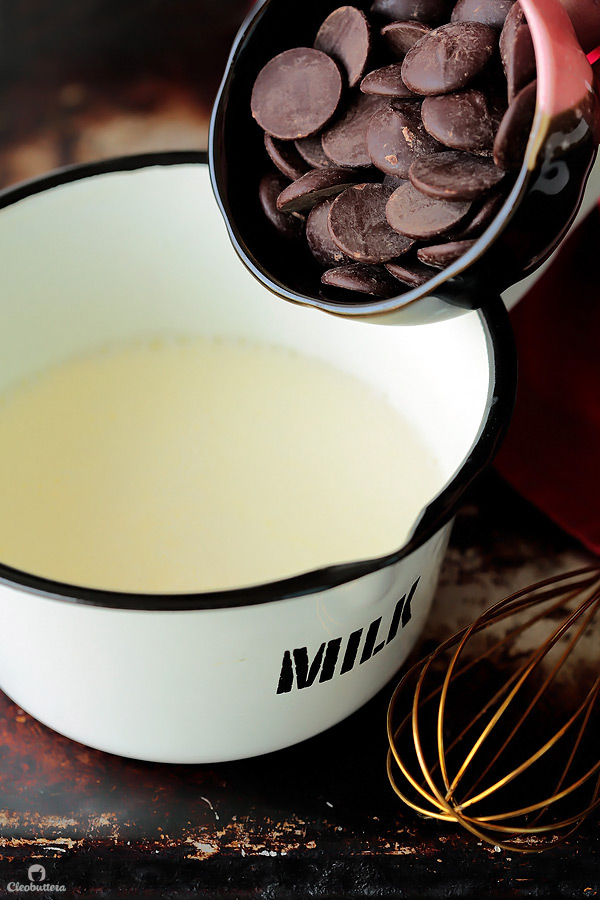 - Σε μια μικρή κατσαρόλα, ρίξτε τη σοκολάτα, την κρέμα γάλακτος, το γάλα, τη ζάχαρη και τη βανίλια και αφήστε να βράσουν σε μέτρια φωτιά.