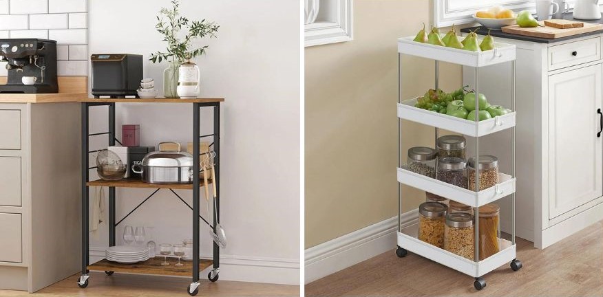 Τέλος, αν σου το επιτρέπουν τα τετραγωνικά της κουζίνας σου, μπορείς να χρησιμοποιήσεις ένα τρόλεϊ-ραφιέρα στο οποίο μπορείς να αποθηκεύεις τα φρούτα και τα λαχανικά σου και να γλιτώνεις χώρο από τη φρουτιέρα πάνω στον πάγκο.