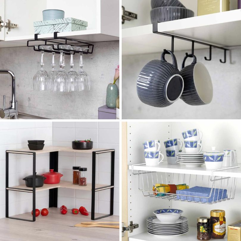 Από κρεμαστά καλάθια αποθήκευσης που μπορείς να βάλεις στο εσωτερικό της πόρτας ενός ντουλαπιού, θήκες συρταριού που θα σου κρατήσουν σε τάξη τα μαχαιροπήρουνα μέσα στο συρτάρι, βάζα και δοχεία για την αποθήκευση των τροφίμων, μέχρι και βάσεις οργάνωσης με θήκες και κρεμάστρες που θα σου επιτρέψουν μερική τοποθέτηση εκτός ντουλαπιών, υπάρχουν πολλά είδη που μπορείς να χρησιμοποιήσεις και την οργάνωση και την πιο σωστή ταξινόμηση των ειδών στην κουζίνας σου.