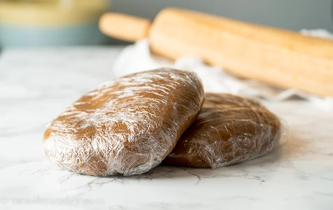 Κόβουμε τη ζύμη σε 2 κομμάτια, τα τυλίγουμε σε πλαστική μεμβράνη και τα βάζουμε στο ψυγείο για 1-2 ώρες.