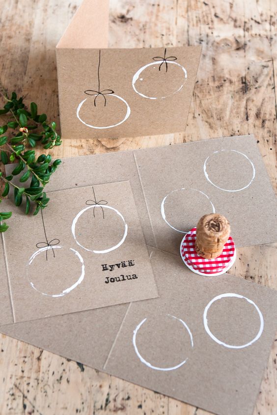 - Βουτάτε το καπάκι της μαρμελάδας στο λευκό χρώμα που έχετε φτιάξει και στη συνέχεια κάνετε μια “σφραγίδα” στο χαρτόνι κραφτ για να φτιάξετε μια χριστουγεννιάτικη μπάλα