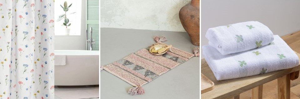 Η ενέργεια του μπάνιου μπορεί να αλλάξει ακόμα και με ένα νέο σετ πετσέτες στις αποχρώσεις της εποχής που φυσικά ταιριάζουν με τη διακόσμηση του μπάνιου σας. Ωστόσο εμείς έχουμε να προτείνουμε κάτι περισσότερο από αυτό. Ένα πατάκι και μια κουρτίνα μπάνιου στα χρώματα του moodboard της άνοιξης θα ανανεώσουν πλήρως το χώρο, ανεβάζοντας τη διάθεσή σας. Η δική μας πρόταση είναι να επιλέξετε πιο παστέλ αποχρώσεις για το μπάνιο, που θα δώσουν χρώμα και θα ταιριάξουν εύκολα με ήδη υπάρχουσες αποχρώσεις όπως λευκά ή ανοιχτόχρωμα πλακάκια, μπεζ, γκρι και γαλάζια που συναντάμε συχνά στα ελληνικά μπάνια.