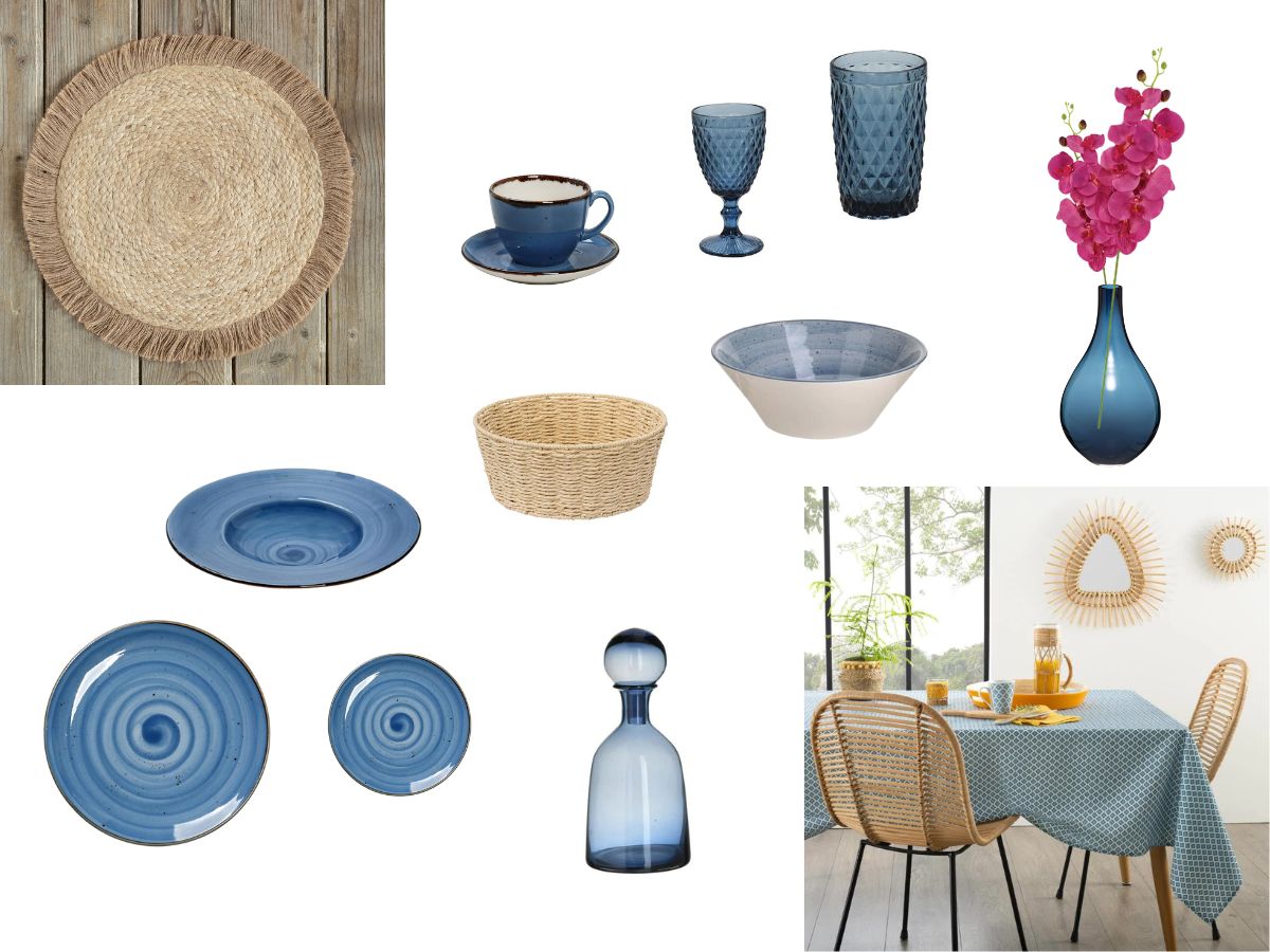 Στην κουζίνα η πιο εύκολη λύση είναι να στρώσετε ένα μπλε τραπεζομάντηλο για να δημιουργήσετε αμέσως καλοκαιρινή διάθεση στο χώρο. Η πρότασή μας είναι να χρησιμοποιήσετε ψάθινα σουπλά και να τα συνδυάσετε με μπλε στοιχεία όπως σερβίτσιο, ποτήρια, και ότι άλλο σας θυμίζει τραπέζι σε παραθαλάσσιο καλοκαιρινό εστιατόριο.