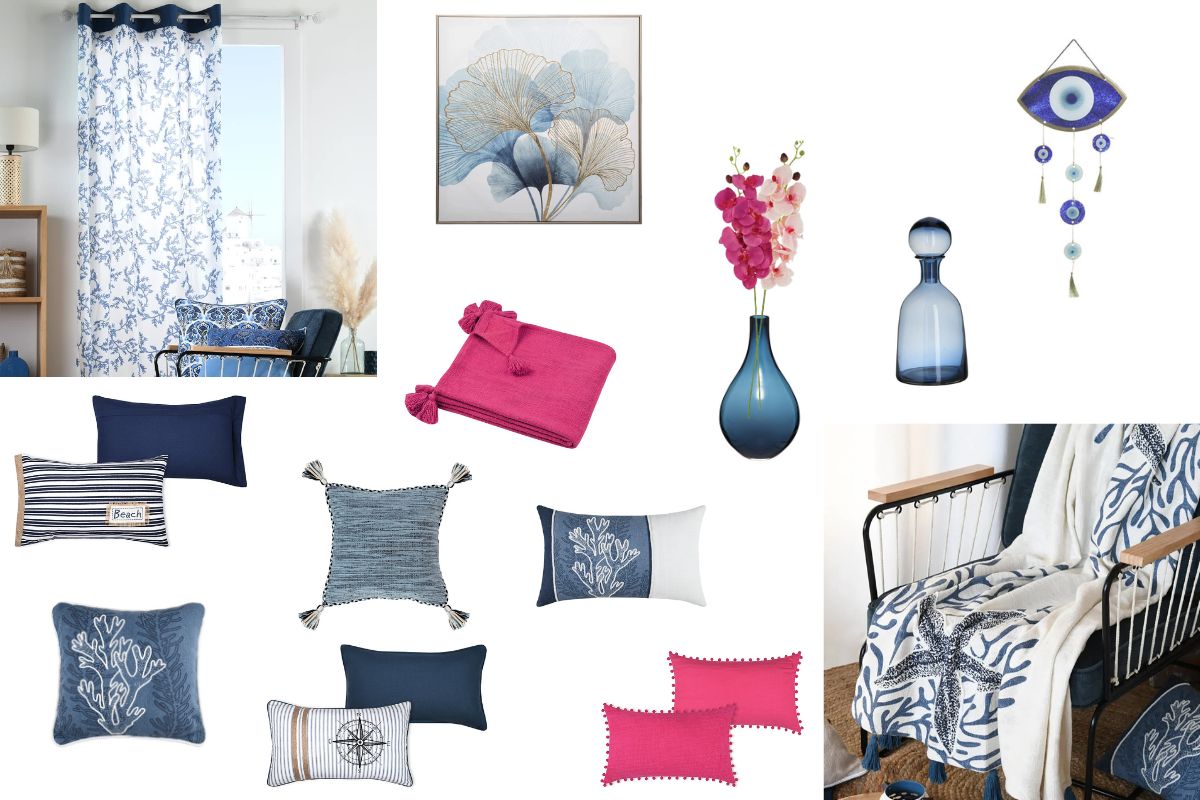 Αν θέλετε να κάνετε πιο έντονο και ζωηρό το σκηνικό, ενσωματώστε μερικά φούξια στοιχεία που θυμίζουν το χρώμα της βουκαμβίλιας που βρίσκεται στα γοητευτικά σοκάκια των νησιών. Με 1-2 φούξια μαξιλαράκια ή ένα φούξια διακοσμητικό ριχτάρι ανάλαφρα απλωμένο σε μια γωνία του καναπέ και μερικά διακοσμητικά κλαδιά βουκαμβίλιας μέσα σε μπλε βάζα σε διάφορα σημεία του σαλονιού για την απόλυτη αίσθηση βόλτας στο νησί.