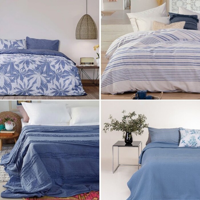 Αν από την άλλη θέλετε κάτι πολύ πιο απλό για την ανανέωση του υπνοδωματίου, μπορείτε να χρησιμοποιήσετε ουδέτερα σκεπάσματα και να προσθέσετε μερικά μαξιλαράκια σε μπλε απόχρωση ή με καλοκαιρινά σχέδια.