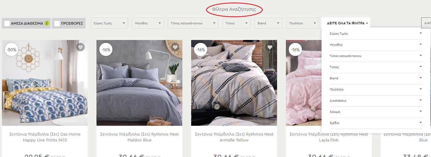 Επιλέξτε για παράδειγμα στο εύρος τιμής το ποσό που θα επιθυμούσατε να διαθέσετε για την αγορά σας, καθώς και τη διάσταση/το μέγεθος ή το χρώμα που θα θέλατε να έχει το προϊόν που αναζητάτε.