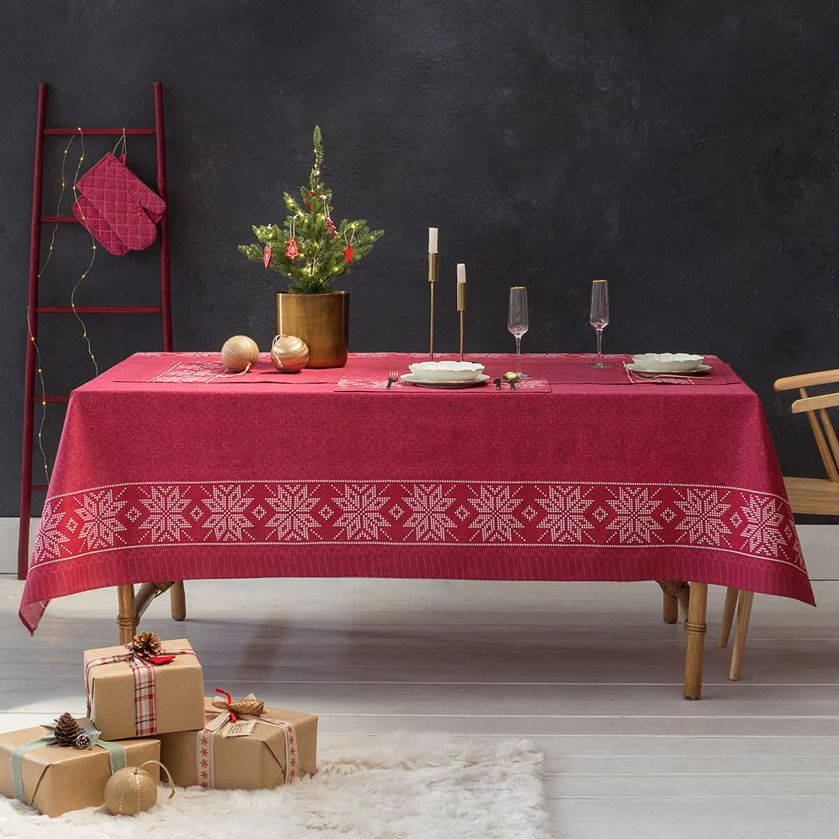 Στην τραπεζαρία σας μπορείτε να βάλετε μια τραβέρσα ή ένα όμορφο γιορτινό τραπεζομάντηλο με εντυπωσιακές πιατέλες ή ορντεβιέρες με τα γλυκά των ημερών.