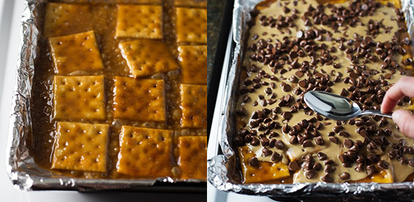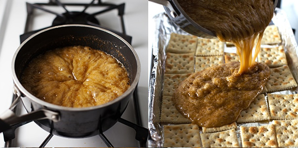 Λιώστε το βούτυρο και τη καστανή ζάχαρη σε ένα μικρό αντικολλητικό κατσαρολάκι. Όταν βράσει, αφήστε το χωρίς να το ανακατέψετε για 3 λεπτά. Χύστε το μίγμα πάνω στα κράκερς και βάλτε τα στον φούρνο για 5 λεπτά.