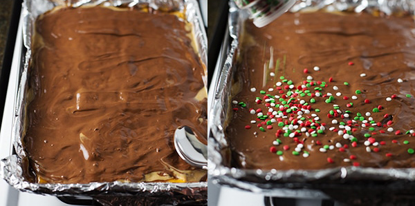 Βγάλτε το απ’ τον φούρνο και ρίξτε το φυστικοβούτυρο πάνω στα καυτά κράκερς. Ψήστε τα στο φούρνο για άλλο 1 λεπτό για να λιώσει. Απλώστε το φυστικοβούτυρο και ρίξτε από πάνω τις σταγόνες σοκολάτας.