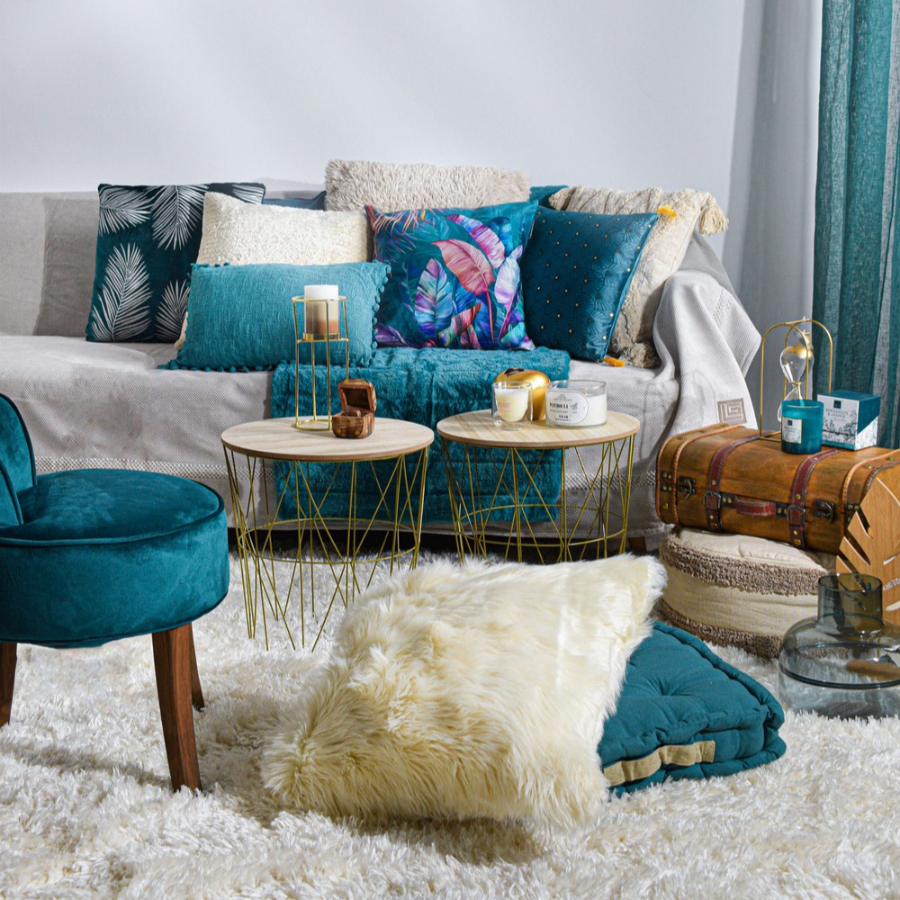 Τέλος, εφόσον βρισκόμαστε στην καρδιά του χειμώνα, επιλέξτε όσο περισσότερες γούνινες, βελουτέ και γενικά αφράτες, απαλές επιφάνειες μπορείτε, σε ανοιχτόχρωμες αποχρώσεις που θα ζεστάνουν το χώρο και θα δώσουν ακόμα μεγαλύτερη ένταση και βάθος στα πετρόλ στοιχεία.