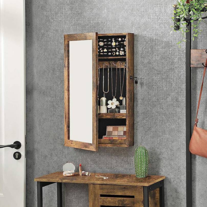 Στα πλαίσια της οργάνωσης κοσμημάτων, δεν μπορούμε να μην αναφέρουμε τον επιτοίχιο καθρέφτη με ενσωματωμένο ντουλάπι κοσμημάτων από ξύλο MDF σε καφέ ρουστίκ χρώμα. Εσωτερικά διαθέτει κοσμηματοθήκη, επενδυμένη με μαύρο ύφασμα, που προσφέρει θέσεις για κολιέ, σκουλαρίκια, βραχιόλια και ράφια για να τακτοποιείς τα καλλυντικά σου. Πρόλαβέ τον για λίγα ακόμη διαθέσιμα τεμάχια.