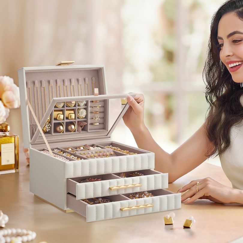 Η κατηγορία "Οργάνωση Καλλυντικών & Κοσμημάτων" εμπλουτίζεται διαρκώς με ιδιαίτερους κωδικούς που σας ξετρελαίνουν όσο και εμάς. Μετά τις καλοκαιρινές διακοπές, η οργάνωση των κοσμημάτων μας είναι απαραίτητη και το εικονιζόμενο σχέδιο με 1 ανοιγόμενη θήκη και 2 συρτάρια τα οποία έχουν χωρίσματα που δημιουργούν χώρους κατάλληλους για βραχιόλια, σκουλαρίκια, δαχτυλίδια, κολιέ ή για ό,τι άλλο θέλεις, είναι αυτό ακριβώς που χρειάζεσαι! Εξωτερικά είναι επενδεδυμένο με λευκό συνθετικό δέρμα και εσωτερικά είναι μπεζ βελούδο. Διαθέτει επίσης καθρέφτη για να ελέγχεις εύκολα ποια κοσμήματα ταιριάζουν στο look σου!