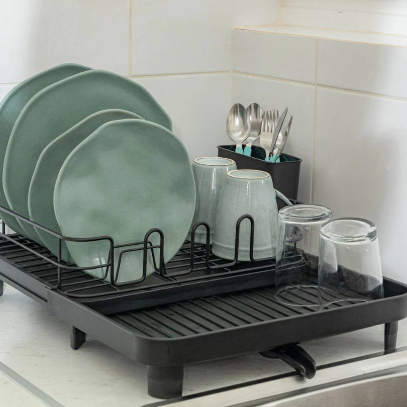 Ένα προϊόν που συναντήσαμε σε πολλά καλάθια αγορών την εβδομάδα Makeover Κουζίνας του Μαΐου ήταν η επιφάνεια στεγνώματος πιάτων με πλαστικό δίσκο συλλογής νερού που αφαιρείται εύκολα και επιτρέπει να διατρέχει προς τον νεροχύτη.