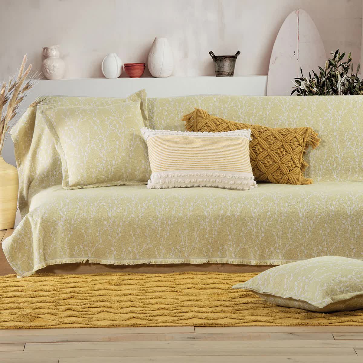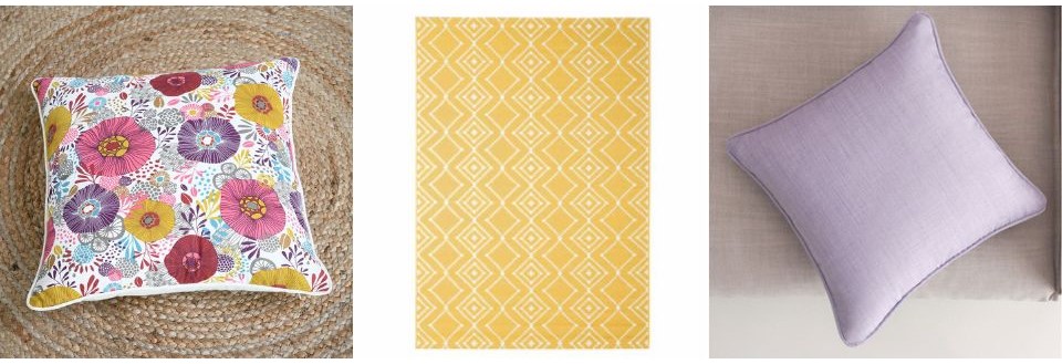 Το ριχτάρι Estia Yellow της Nef-Nef σε ένα τόσο χαρούμενο και φωτεινό κίτρινο μας έφτιαξε τη διάθεση απ’ την πρώτη μέρα που το αντικρύσαμε! Το συνδυάσαμε με μερικές διακοσμητικές μαξιλαροθήκες Gofis Home Chrome Violet και S-F Chidori/Aquitane Rouge και το αποτέλεσμα μας γέμισε χαμόγελα! Για να ολοκληρώσουμε το look προσθέσαμε την κουρτίνα Gofis Home Combe Violet και το χαλί Royal Carpets Flox 47 Yellow.