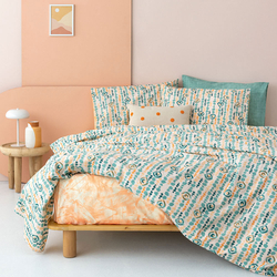Η δεύτερη πρότασή μας αποτελείται από τα σεντόνια Palamaiki Fashion FL6206 σε τιρκουάζ και ροδακινί, το κουβερλί Palamaiki Juniper Coral και τις διακοσμητικές μαξιλαροθήκες Singapour Emeraude και Gofis Home Monifa για το κρεβάτι, την κουρτίνα Jacala Voilage και αυτή τη φανταστική μπιζουτιέρα - κολοκύθα που είναι τόσο εκκεντρική όσο χρειάζεται ένα χαρούμενο δωμάτιο.