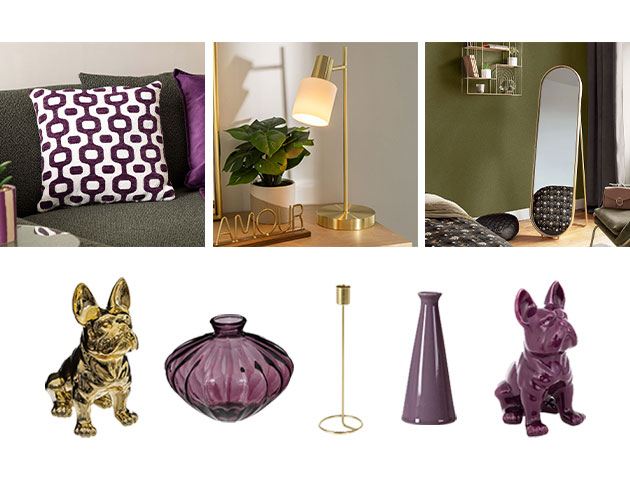 Για να τελειοποιήσεις το αποτέλεσμα, τοποθέτησε μερικά διακοσμητικά αντικείμενα σε μωβ και χρυσό. Μερικά κομψά βάζα σε χρυσό χρώμα, αλλά και ένα χαμηλό σκαμπό με μεταλλικά πόδια και βελούδινο κάθισμα σε αποχρώσεις του μωβ, θα προσθέσουν μια νότα πολυτέλειας και θα ολοκληρώσουν την αισθητική του χώρου.