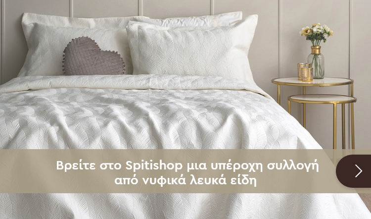 Στο Spitishop θα βρείτε υπέροχα λευκά είδη για κάθε δωμάτιο του σπιτιού σας. Για την κρεβατοκάμαρα, επιλέξτε σεντόνια, παπλώματα, παπλωματοθήκες και άλλα πολλά εξαιρετικής ποιότητας που θα προσφέρουν στυλ και κομψότητα στη διακόσμηση σας καθώς και προστατευτικά καλύμματα στρώματος και μαξιλάρια ύπνου, ενώ για το μπάνιο, πετσέτες από απορροφητικό βαμβάκι και μπουρνούζια υψηλής ποιότητας θα σας εξασφαλίζουν μια μοναδική εμπειρία spa στο σπίτι σας. Στο σαλόνι διακοσμήστε τον καναπέ σας με διακοσμητικά μαξιλάρια και στρώστε ριχτάρια για να ανανεώσετε με εύκολο τρόπο τον χώρο σας. Στην κουζίνα διαλέξτε τραπεζομάντηλα, πετσέτες φαγητού, τραβέρσες, καρέ καθώς και ποδιές και πιάστρες για να χαρίσετε μοντέρνο στυλ στην κουζίνα και την τραπεζαρία σας. Τα νυφικά λευκά είδη, τα καλοραμμένα σεντόνια, πολυτελή κουβερλί και πετσέτες, αποτελούν την τέλεια επιλογή. Για επαγγελματικούς χώρους όπως ξενοδοχεία και Airbnb, θα βρείτε λευκά είδη υψηλής αισθητική και άνεσης για τους επισκέπτες σας. Τα λευκά είδη που θα βρείτε στο Spitishop θα αναδείξουν κάθε χώρο, θα προσφέρουν ζεστασιά και σίγουρα διαχρονική κομψότητα!