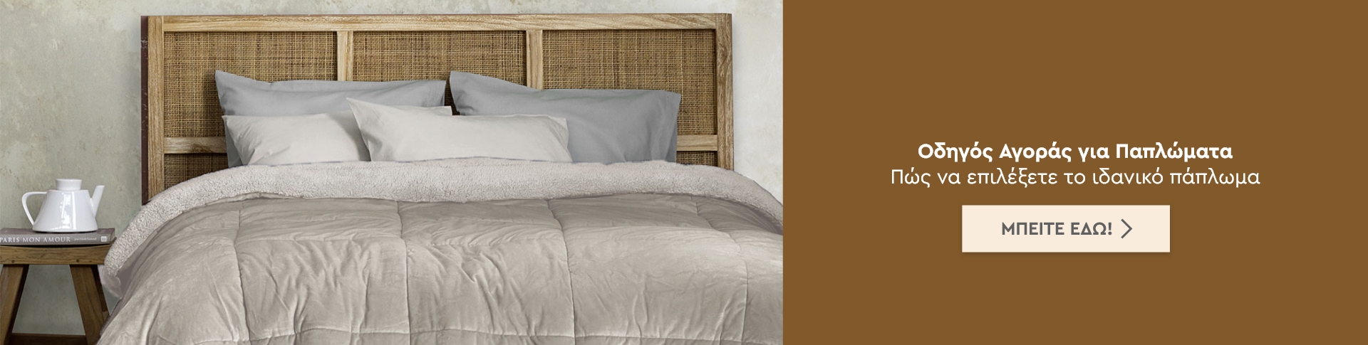 Στο Spitishop θα βρείτε παπλώματα για κάθε ανάγκη και εποχή. Επιλέξτε ανάμεσα σε βαμβακερά παπλώματα με απαλή υφή, πουπουλένια παπλώματα για φυσική ζεστασιά, μάλλινα για τον χειμώνα ή κουβερτοπαπλώματα για έξτρα δόση ζεστασιάς και απαλότητα. Διατίθενται σε μονά, υπέρδιπλα και διπλά, ημίδιπλα και king size μεγέθη, καθώς και παιδικά παπλώματα με χαρούμενα σχέδια. Ακόμη θα βρείτε λευκά, παπλώματα με σχέδιο, παπλώματα polyester ή ακόμα και παπλώματα microfiber σε μεγάλη ποικιλία χρωμάτων και σχεδίων από κορυφαία brands όπως Nef-Nef, Kentia, Das Home κ.α. Κάθε τύπος προσφέρει διαφορετική αίσθηση θερμότητας και στυλ, ώστε να βρείτε εύκολα εκείνο που ταιριάζει στο υπνοδωμάτιο και στις προτιμήσεις σας. Ανακαλύψτε όλα τα παπλώματα της συλλογής μας και επιλέξτε με σιγουριά το αγαπημένο σας! Μη ξεχάσετε να διαβάσετε και τους οδηγούς που έχουμε ετοιμάσει για εσάς με πολύτιμες συμβουλές για να κάνετε την καλύτερη αγορά σε πάπλωμα αλλά και πληροφορίες για τον σωστό τρόπο φροντίδας των παπλωμάτων σας.