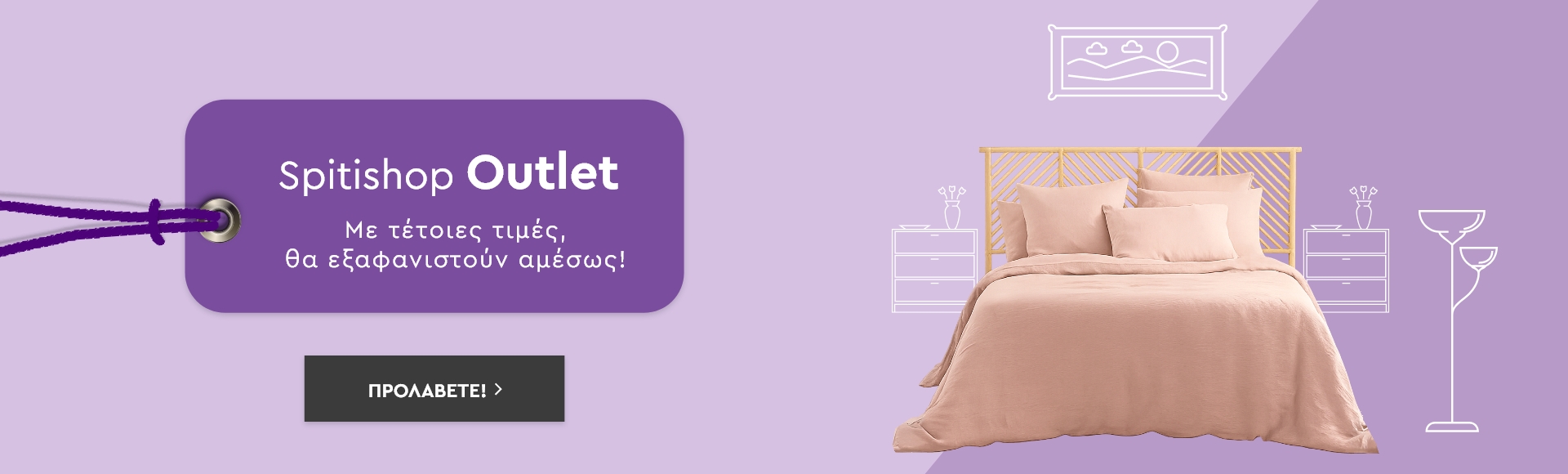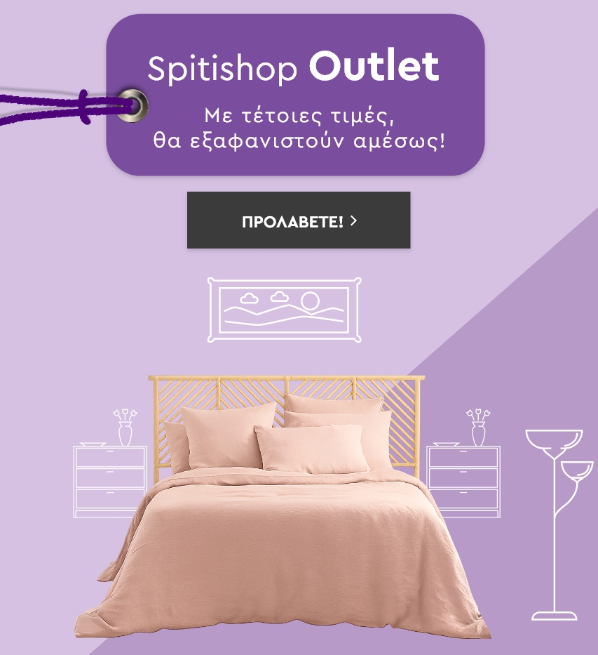 Ανακαλύψτε το Spitishop Outlet και βρείτε μοναδικές επιλογές για κάθε γωνιά του σπιτιού σας! Εδώ θα βρείτε επιλεγμένα κομμάτια που συνδυάζουν ποιότητα, στυλ και προσιτές τιμές, για να ανανεώσετε εύκολα και γρήγορα τη διακόσμηση του χώρου σας. Από την κρεβατοκάμαρα και το μπάνιο, μέχρι το σαλόνι, την κουζίνα και το παιδικό δωμάτιο, στη συλλογή μας θα βρείτε έπιπλα, λευκά είδη, διακοσμητικά, είδη οργάνωσης, χαλιά, φωτιστικά, κουρτίνες, είδη ένδυσης, είδη κηπουρικής, εποχιακά είδη και πολλά ακόμη για να ανανεώσετε το σπίτι σας με τον πιο οικονομικό τρόπο. Δώστε νέο χαρακτήρα στο σπίτι σας με επιλογές outlet που ξεχωρίζουν για το design και την ποιότητά τους πάντα στις καλύτερες τιμές και μόνο στο Spitishop!