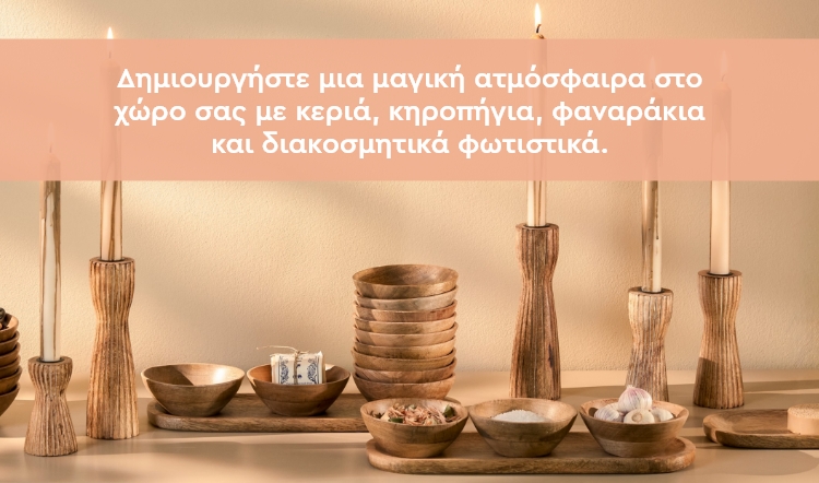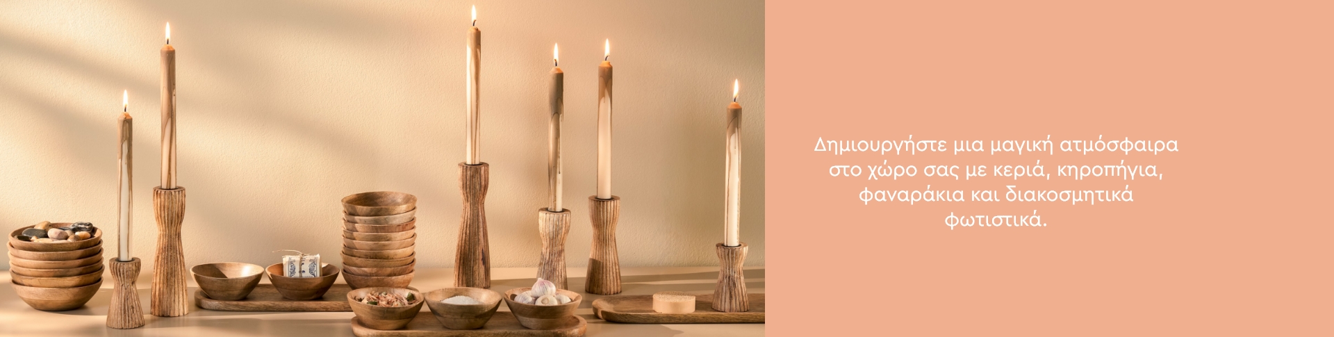 - Κηροπήγια και βάσεις κεριών σε πολλά σχέδια, σχήματα και μεγέθη για ρεσώ ή για κεριά δείπνου. Συνδυάστε διαφορετικού τύπου κηροπήγια ή επιλέξτε κηροπήγια ίδιου σχεδιασμού και στολίστε το τραπεζάκι του σαλονιού σας ή το σύνθετό σας ώστε να δημιουργήσετε μια γλυκιά, ζεστή και ρομαντική ατμόσφαιρα.