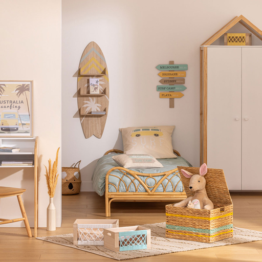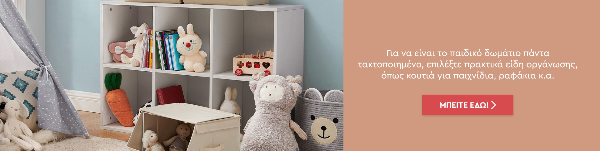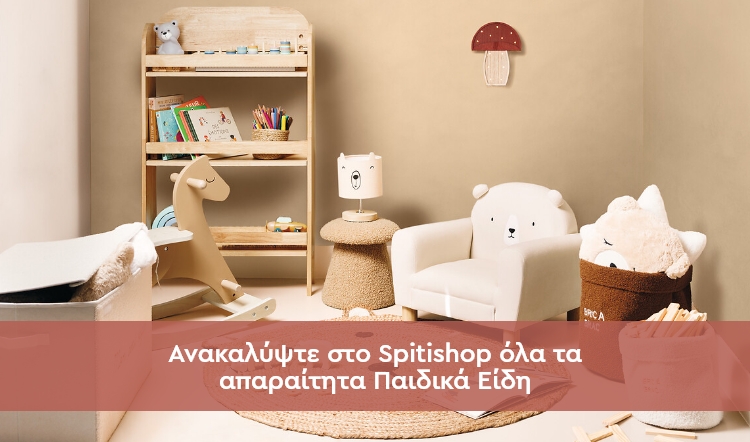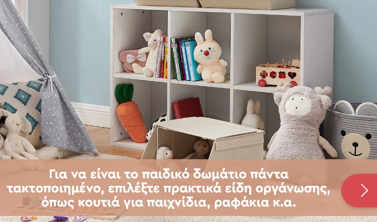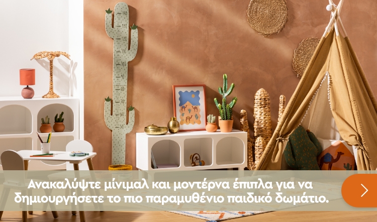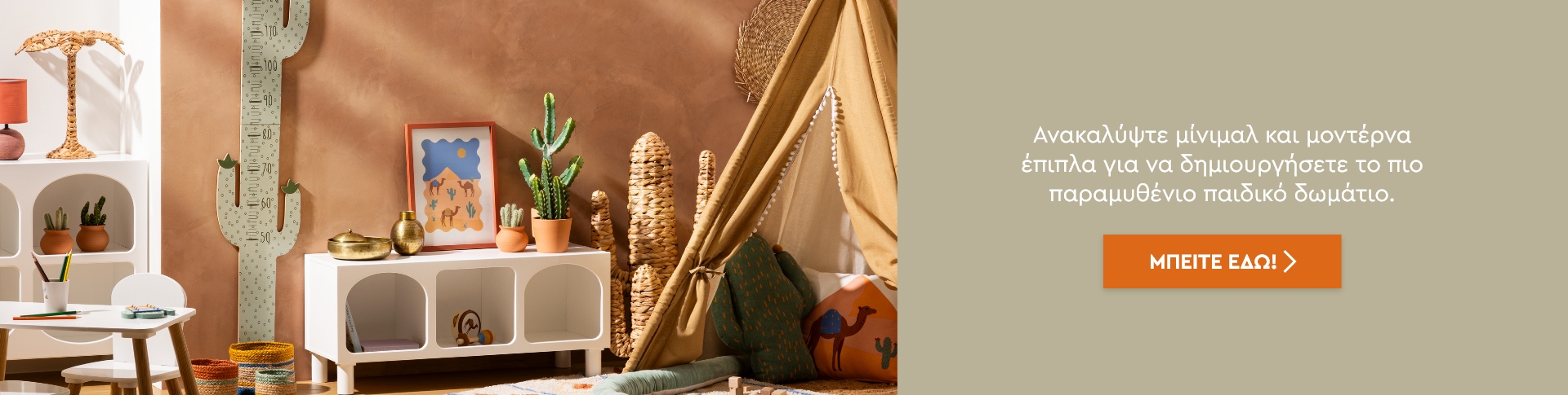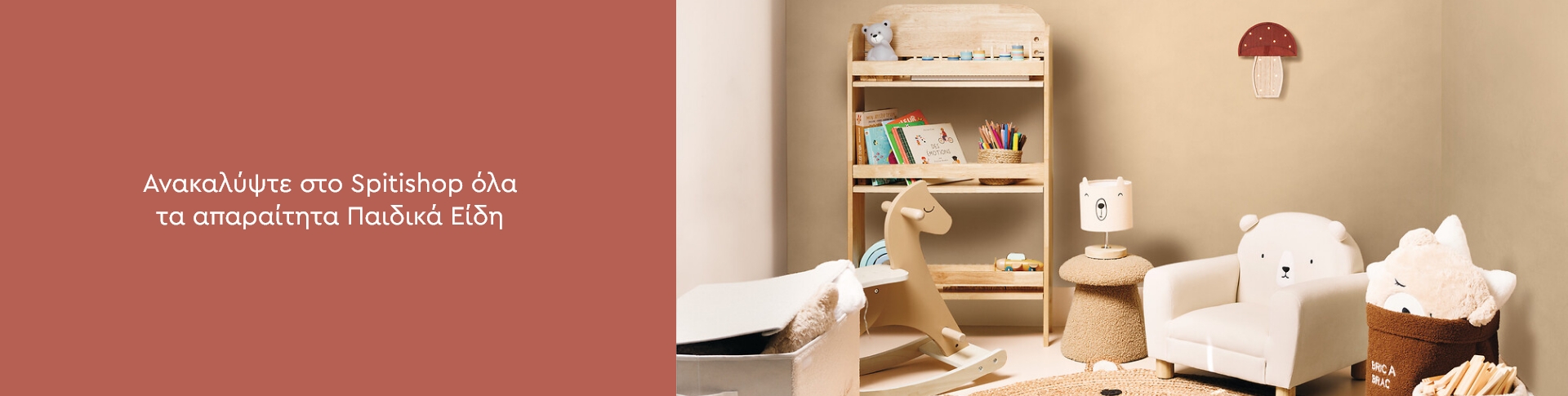 Ένας από τους πιο σημαντικούς χώρους σε ένα σπίτι είναι το παιδικό δωμάτιο. Είναι ο χώρος όπου τα παιδιά περνούν πολύ χρόνο ήδη από μωρά και ξεκινούν να κάνουν τα πρώτα τους όνειρα! Δημιουργήστε ένα παραμυθένιο δωμάτιο για το παιδάκι σας και διακοσμήστε το με μοντέρνα παιδικά έπιπλα. Βρείτε παιδικές βιβλιοθήκες, παιδικά τραπεζάκια και καρεκλάκια, κρεβάτια, κούνιες, παιδικές σκηνές αλλά και πρωτότυπα παιδικά έπιπλα εμπνευσμένα από τη μέθοδο Montessori. Επιλέξτε παιδικά σεντόνια και μαξιλαροθήκες σε πρωτότυπα σχέδια και ζωηρά χρώματα και συνδυάστε τα με παιδικές κουβέρτες και παπλώματα κορυφαίας ποιότητας. Κρατήστε το παιδικό δωμάτιο ζεστό με τα παιδικά χαλιά και συνδυάστε τα με ξεχωριστές και όμορφες παιδικές κουρτίνες. Προσθέστε χρώμα και ζωντάνια στο χώρο με τα διακοσμητικά μαξιλάρια και τα παιδικά φωτιστικά. Για το μπάνιο θα βρείτε απαλές βαμβακερές πετσετούλες και απορροφητικά παιδικά μπουρνούζια και για την οργάνωση του παιδικού δωματίου μια μεγάλη ποικιλία από καλάθια, θήκες οργάνωσης κ.α. Μην ξεχάσετε να ρίξετε μια ματιά και στα σχολικά είδη και να διαλέξετε όλα όσα χρειάζεστε ανάμεσα σε σχολικές τσάντες, τσάντες φαγητού, κασετίνες, παγούρια κ.α. Γεμίστε το καλάθι σας με προϊόντα από γνωστά brands όπως Guy Laroche, Disney, Nef-Nef, Nima, SaintClair, Kentia, Palamaiki, Rythmos, LorenaCanals, DasHome και μεταμορφώστε το δωμάτιο των μικρών μας φίλων σε ένα ονειρεμένο χώρο γεμάτο αγάπη και θαλπωρή!