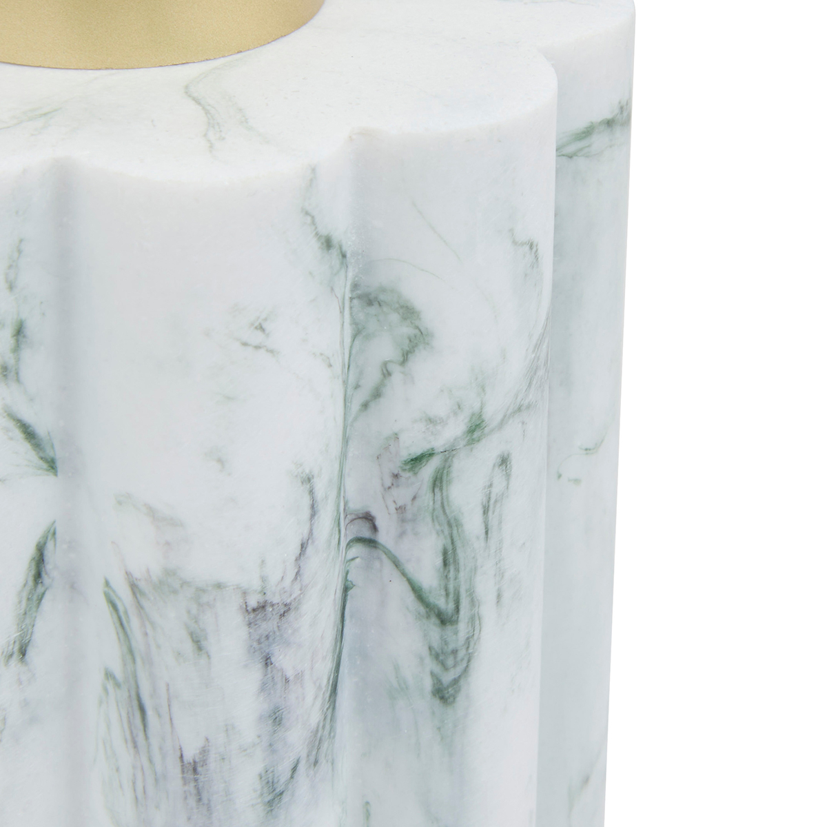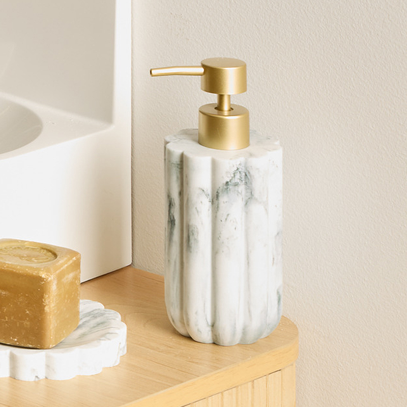 Δοχείο κρεμοσάπουνου με μοντέρνο σχεδιασμό. Είναι κατασκευασμένο από polyresin υλικό σε λευκό χρώμα με εφέ μαρμάρου και χρυσό καπάκι. Ιδανικό να ταιριάξει σε κάθε μπάνιο. Συνδυάστε το με τα υπόλοιπα προϊόντα του ίδιου σετ για ένα ολοκληρωμένο αποτέλεσμα. Χωρητικότητα: 300ml.