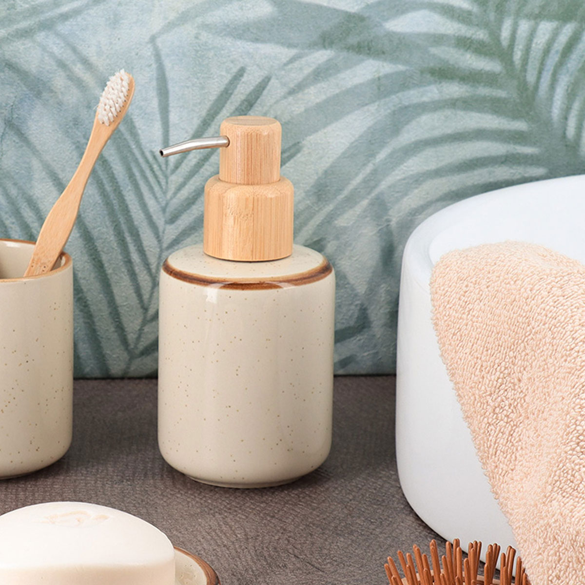 Δοχείο κρεμοσάπουνου σε μπεζ χρώμα, με εκρού λεπτομέρειες. Κατασκευασμένο από κεραμικό υψηλής ποιότητας Gres, που προσφέρει εξαιρετική αντοχή στην υγρασία και στη καθημερινή χρήση, με λεπτομέρεια από ξύλο bamboo. Ιδανικό να ταιριάξει σε κάθε μπάνιο. Συνδυάστε το με τα υπόλοιπα προϊόντα του ίδιου σετ για ένα ολοκληρωμένο αποτέλεσμα στο μπάνιο σας. Χωρητικότητα: 300ml.