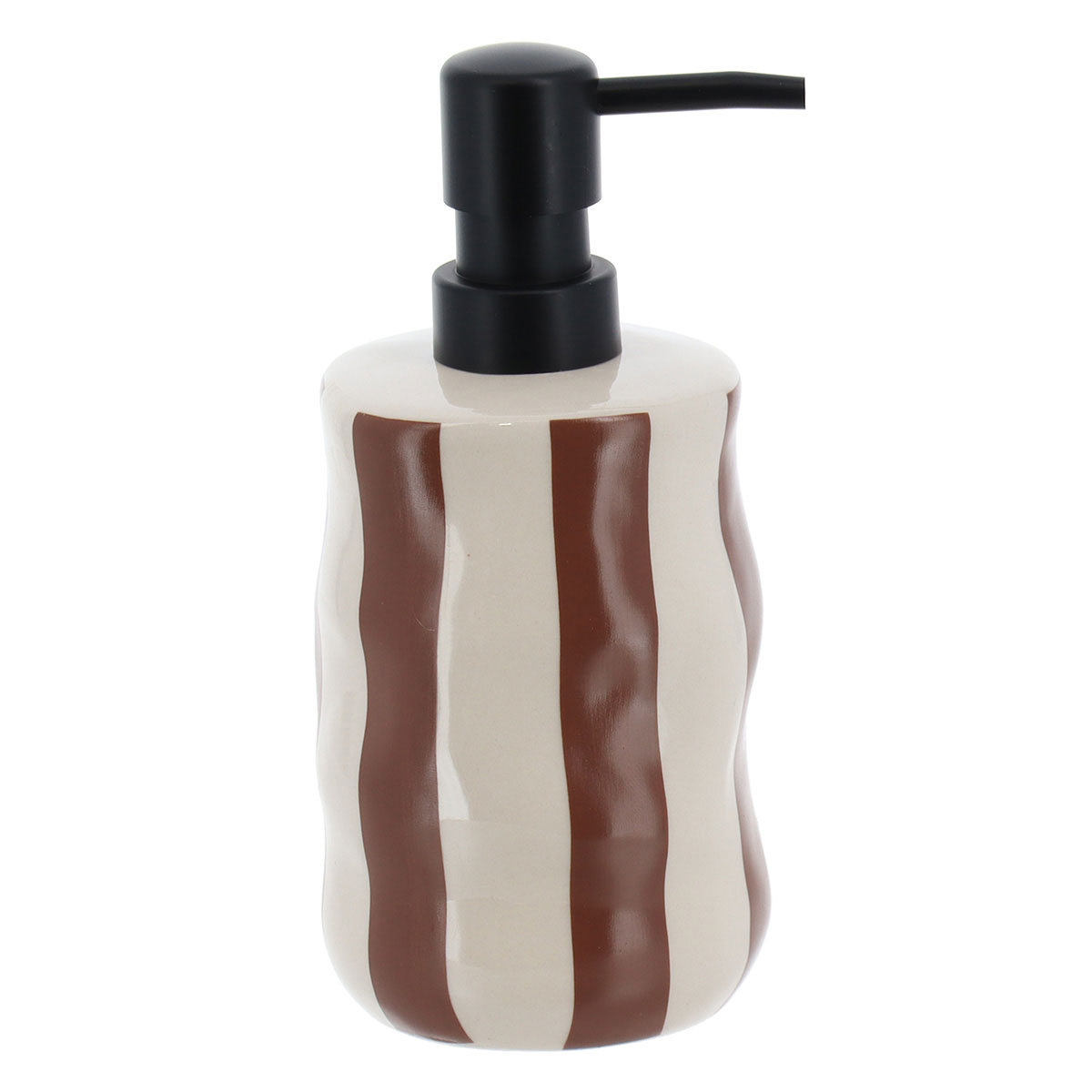 Δοχείο κρεμοσάπουνου σε τερακότα-λευκό χρώμα, με ριγέ σχέδιο. Κατασκευασμένο από κεραμικό υψηλής ποιότητας Gres, που προσφέρει εξαιρετική αντοχή στην υγρασία και στη καθημερινή χρήση. Ιδανικό να ταιριάξει σε κάθε μπάνιο. Συνδυάστε το με τα υπόλοιπα προϊόντα του ίδιου σετ για ένα ολοκληρωμένο αποτέλεσμα στο μπάνιο σας. Χωρητικότητα: 350ml.