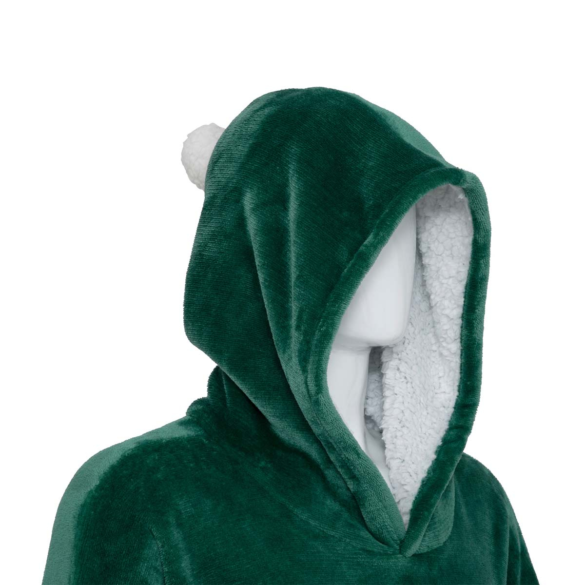 Fleece χειμωνιάτικο φούτερ με εσωτερική επένδυση γούνα sherpa ιδανικό για μέσα στο σπίτι. Είναι σε πράσινο χρώμα, με πομ πομ στην κουκούλα, κατασκευασμένο από polyester που προσφέρει εξαιρετική ζεστασιά. Είναι one size και καλύπτει μέγεθος μέχρι XLarge. Το μήκος μανικιού είναι 55εκ., το ύψος της κουκούλας είναι 35εκ. και η τσέπη είναι 24x30εκ.